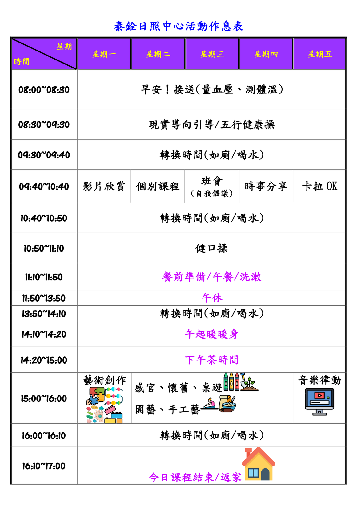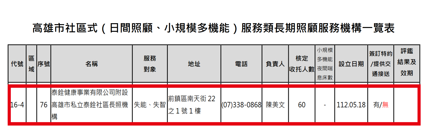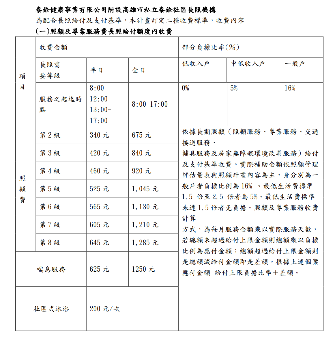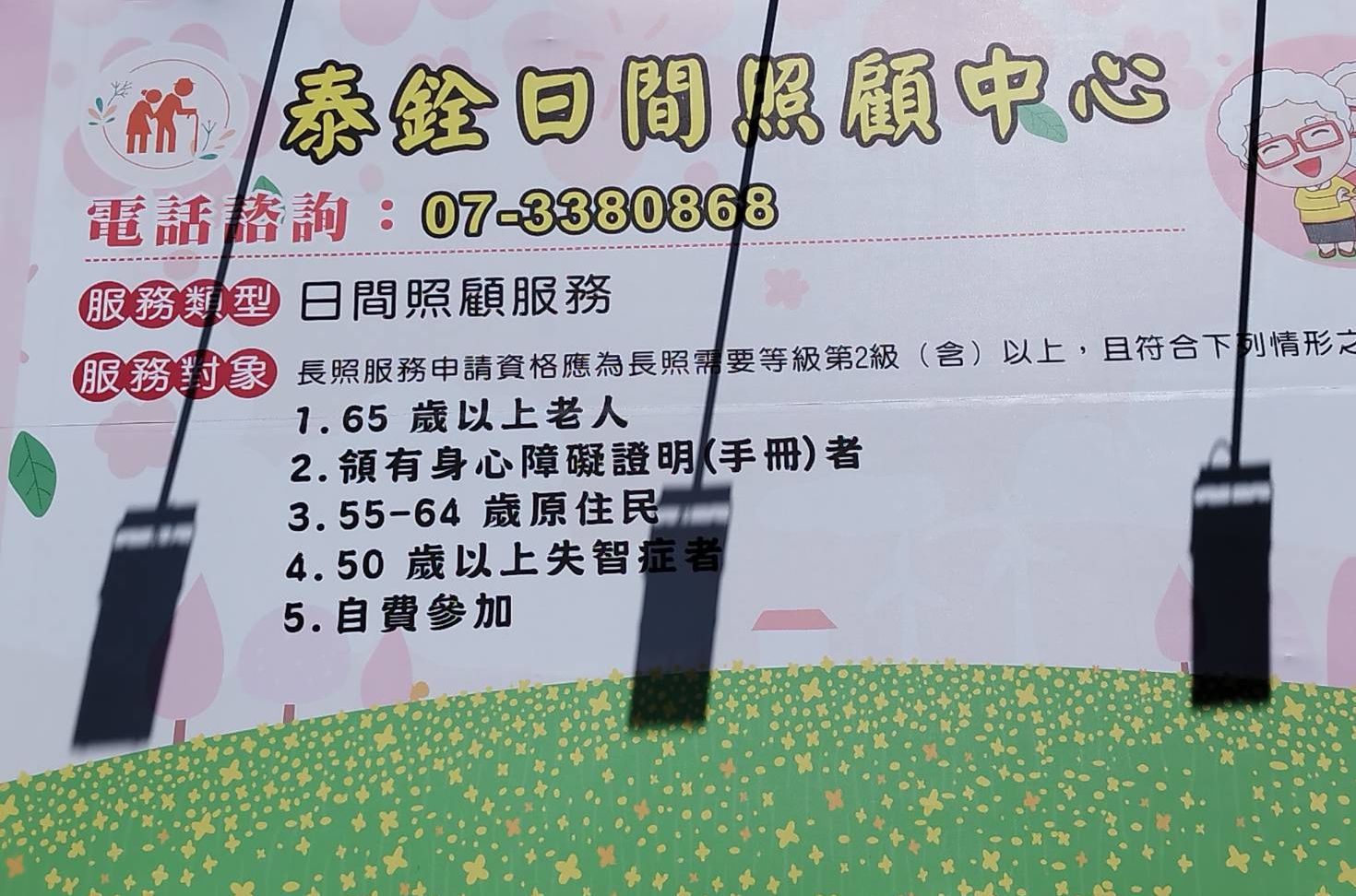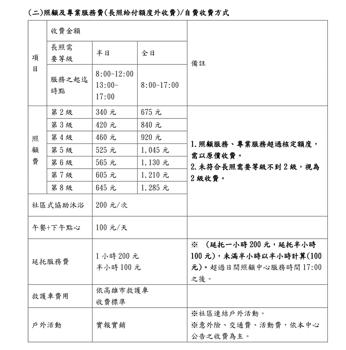 服務電話:07-3380868 長照類型:日間照顧 服務對象:長照服務申請資格應為長照需要等級第2級(含)以上,且符合下列條件之一者: 1,65歲以上老人 2,領有身心障礙證明(手冊)者 3,55-64 歲原住民 4,50歲以上失智者 5,自費參加